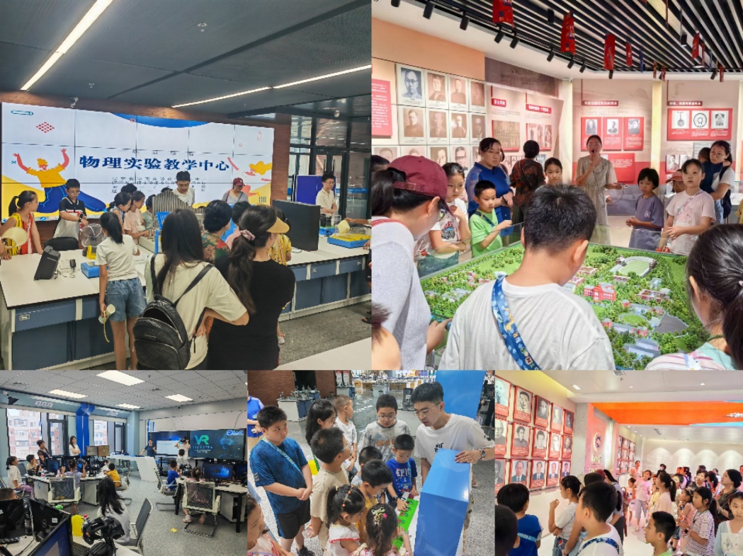 活动共包含校史馆探寻之旅和物理实验室体验之旅两个环节。在校史馆中,讲解员带领孩子们回溯学校发展历程,帮助孩子们深入了解太阳成集团tyc33455的底蕴与文化。其后,在物理实验室体验之旅中,孩子们分为三组依次进行不同项目的体验探索,包括“解密魔术”等演示实验、“马格努斯滑翔机”等互动实验、“深海蓝鲸”等VR互动体验。孩子们在指导教师演示后,进行动手操作体验,实现了创新思维和实践能力多重提高。