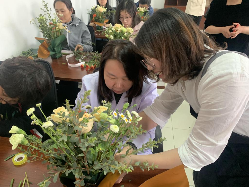 校工会持续探索多校区同步服务新模式,此次特邀专业花艺师为教职工讲授插花基本知识、常见花卉的种类及特点,重点讲解了插花的造型、色彩应用要点,还现场演示了插花的技巧。活动现场,老师们在花艺师的指导下,积极学习,主动实践,氛围热烈。